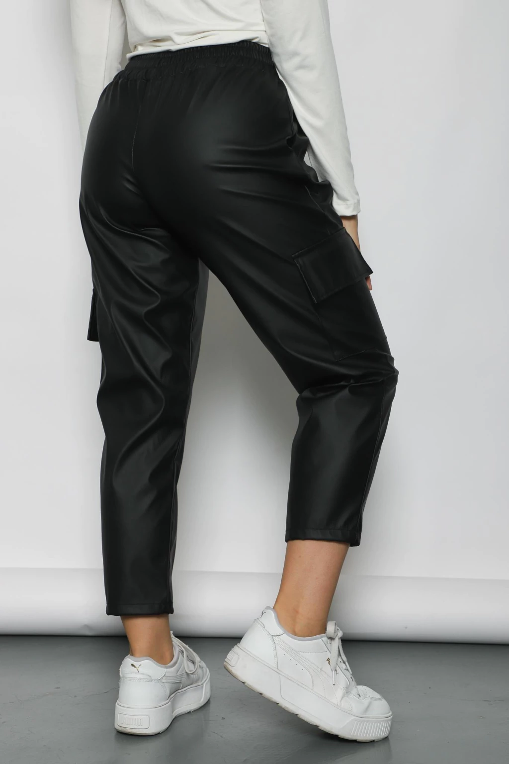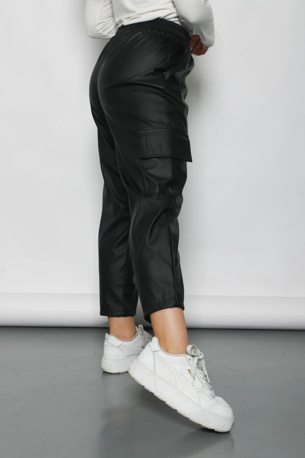 Nuestro pantalón cargo de ecocuero negro es la pieza clave para darle un toque audaz a tu look. Su diseño oversize y su cintura elástica ajustable te brindan la máxima comodidad y libertad de movimiento. El material de ecocuero de alta calidad le confiere un aspecto sofisticado y duradero. Combínalo con una remera básica y zapatillas para un look casual, o con un crop top y botas para una salida nocturna.